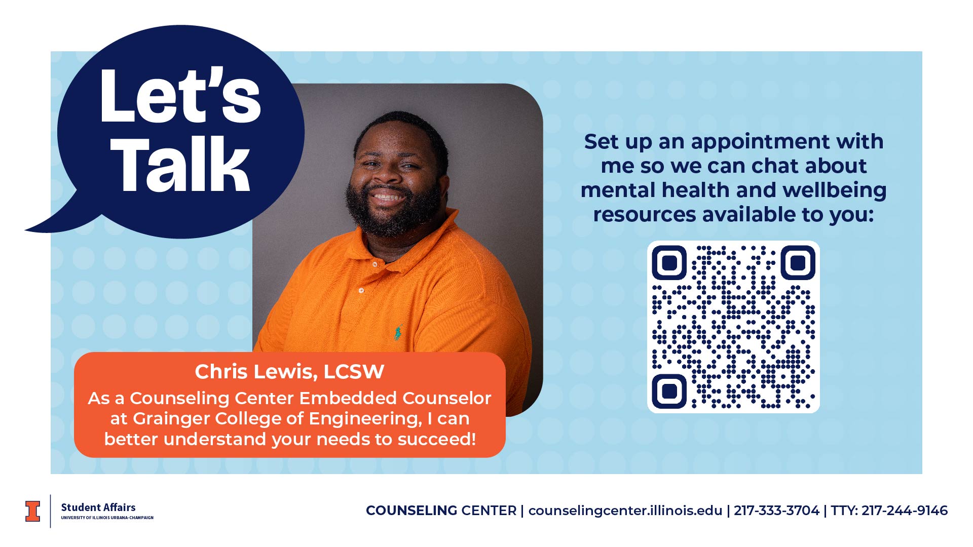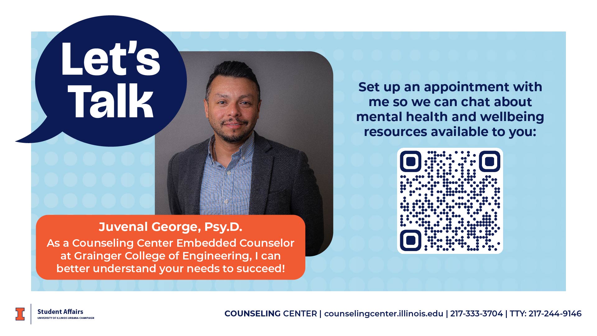 Meet with the Grainger Embedded Counselors, Dr. Juve George or Chris Lewis about counseling center services or other campus resources that help you prioritize your mental health!